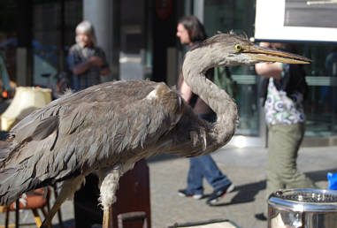 Ein ausgestopfter und schon etwas gerupfter Graureiher an den Ständen bei der Spitalgasse |