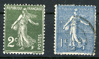 Allegorieausgaben, links 2 Centimes von 1876 und rechts 2 Francs Wert von 1900 |
